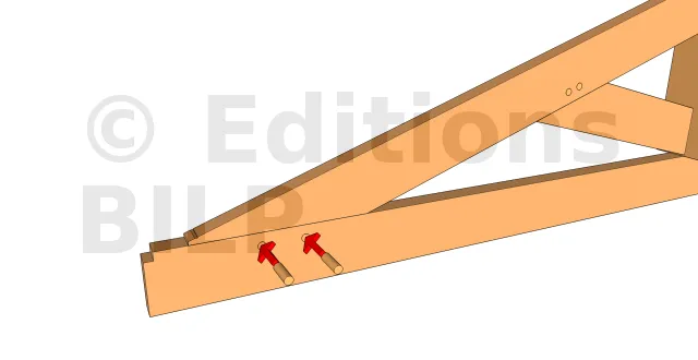 - 2 : Ensuite, entrer le tenon de l’arbalétrier sur le poinçon en même temps que le tenon de la contrefiche sur la mortaise de l’arbalétrier,