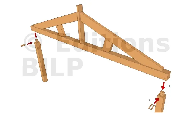 Technique adaptée pour une ferme avec un entrait simple. Les tenons sont réalisés sur les poteaux tandis que les mortaises sont façonnées sur l’entrait.