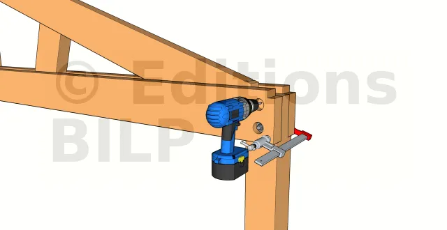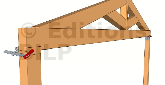 - 2 : Maintenir la ferme aux poteaux avec des serre-joints : fixer ensemble l’entrait et le poteau avec un serre-joint du côté extérieur du poteau. Pour assurer une bonne prise du serre-joint sur une plus large surface, ajouter une planche de bois entre le poteau et le serre-joint. Si l’entrait dépasse le poteau en porte-à-faux, le serre-joint est incliné vers le bas.