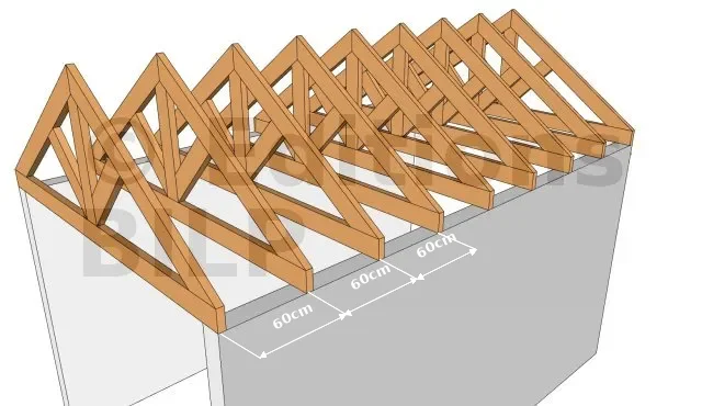 Les fermes de notre exemple sont disposées sur les murs avec un entraxe de 60cm. Elles reçoivent directement la couverture, sans isolation.