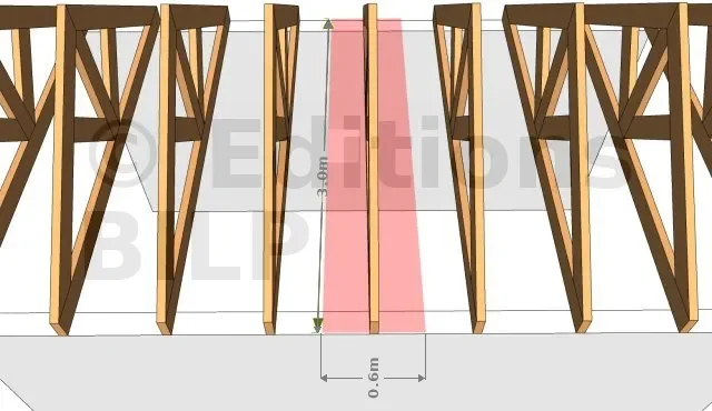 - Pour un entraxe régulier : cette surface correspond à l’entraxe E des fermes multiplié par la longueur L de l’entrait.