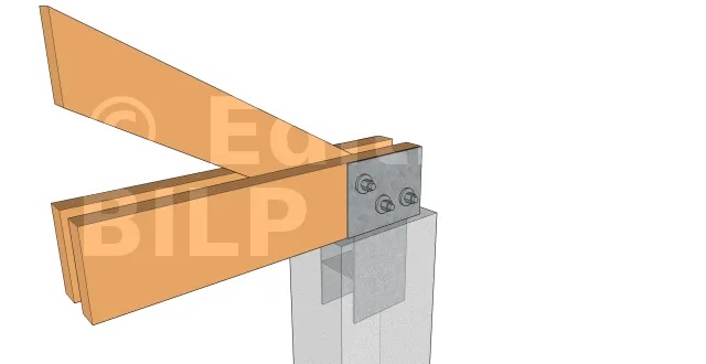 Dans le cas d’une ferme qui va prendre appui sur un poteau en béton, ce dernier est en général doté d’une section assez faible. La ferme va alors être assemblée au poteau par un ferrure que vous allez sceller en plein milieu du poteau. C’est le type d’assemblage le plus couramment utilisé. Pour ce faire, vous allez utiliser un étrier en fer plat qui sera calé en utilisant du mortier de ciment. L’étrier sera alors raidi grâce à un fer d’ancrage qui doit avoir à peu près la même largeur que l’étrier pour éviter que les fers plats subissent des déformations.