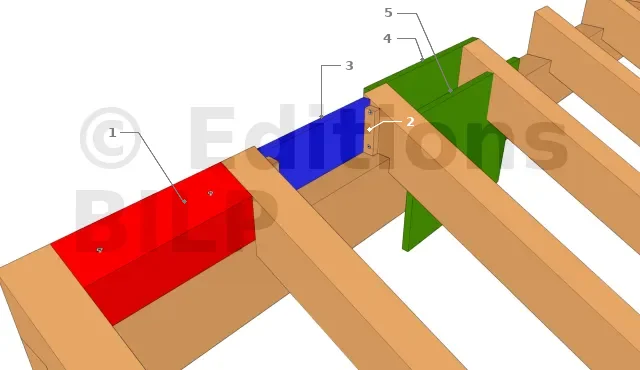 - En bleu : des tasseaux (2) sont fixés contre les chevrons. Puis une planche est fixée contre les tasseaux. Cette méthode peut être mise en œuvre plus tard dans la construction mais elle n’offre pas une très bonne étanchéité et la fixation des tasseaux n’est pas évidente à réaliser correctement.