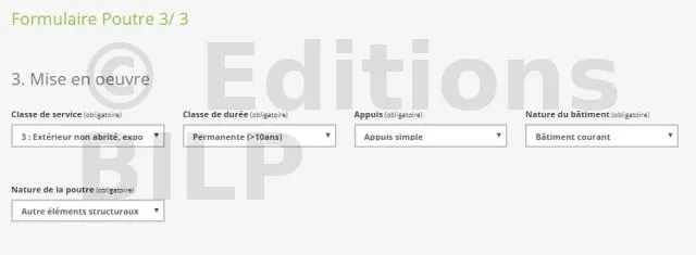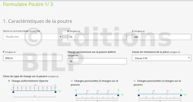 Le calcul de la section des chevrons est dépendant du précédent calcul et les données insérées ainsi que les résultats obtenus précédemment sont reportées automatiquement sur cet outil de calcul.