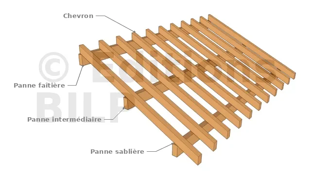 - la panne faîtière est celle qui se trouve au sommet (au faît) de la charpente. Elle reçoit la partie supérieure des chevrons.