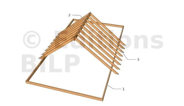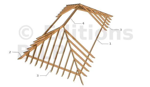 Le montage de la charpente à arêtes doit se faire en 2 temps. Le premier consiste au montage des 2 versants simples et le deuxième au montage des 2 autres versants qui sont composées des croupes.