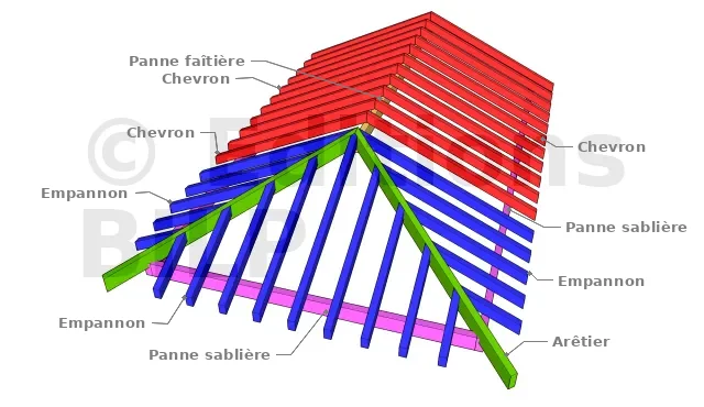 Les chevrons (en rouge) couvre la distance entre la panne faîtière (en jaune) et la panne sablière (en rose). Les arêtiers (en vert) sont connectés à la faîtière en formant en angle où les deux plans de la toiture se rejoignent. Les empannons (en bleu) sont des chevrons coupés qui courent des arêtiers à la sablière.