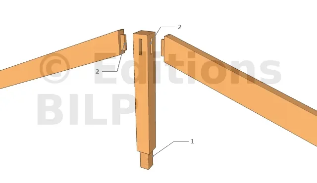 - 1 : Fixer les arêtiers de chaque côté à la tête du poinçon par tenon mortaise