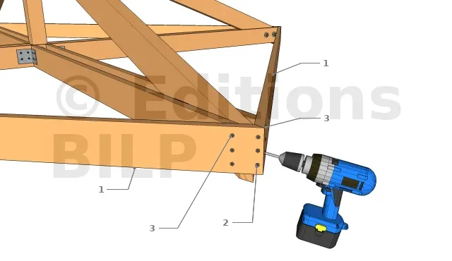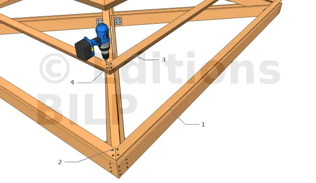 - 1 : Poser les traverses en vous assurant qu’elles forment un angle droit au niveau des extrémités des faux entraits