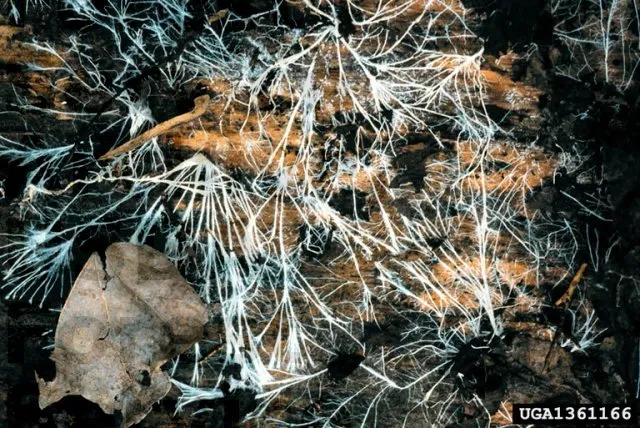 - Pourriture fibreuse blanche : le polypore des caves (Coriolus versicolor, Donkioporia expansa et Phellinus megaloporus)