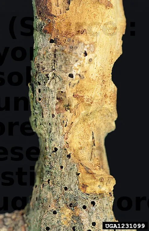 Ce ravageur du bois laisse derrière lui des orifices d’envol de 2 à 4 mm de largeur. On remarque la cellule larvaire plate et lenticulaire. Importance économique : peu de dégâts. Très répandue en Angleterre depuis des années, récemment aussi en Hollande.
