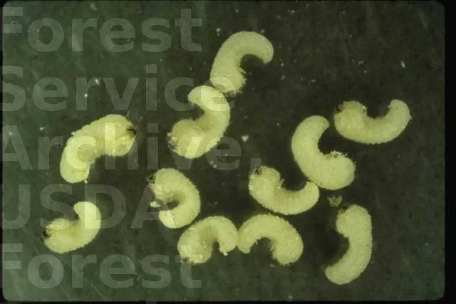 La larve mesure de 4 à 6 mm de longueur, allure de ver blanc, blanc jaunâtre, partie thoracique dotée de trois paires de pattes bien discernables. Envol : d’avril à août. Durée du développement de la larve : de 8 à 36 mois, voire jusqu’à dix ans si les conditions ne sont pas favorables.