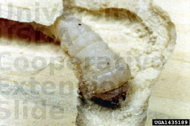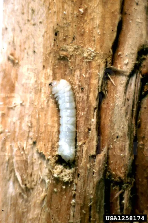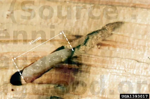 Les larves apparaissent après 3 semaines et s’alimentent dans l’aubier puis dans le bois en creusant une galerie de 10 à 25 cm de longueur, dont la taille augmente avec celle des larves. La croissance de la larve est favorisée par l’humidité.