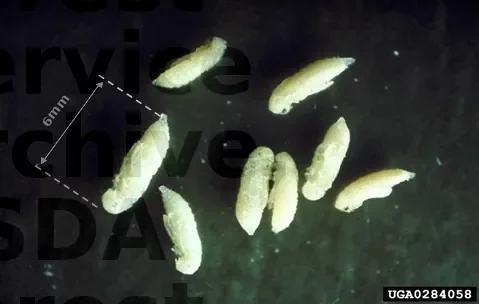 La larve mesure de 15 à 30 mm de longueur (belle bête !). Elle est de couleur blanc ivoire, corps plus large à la tête
