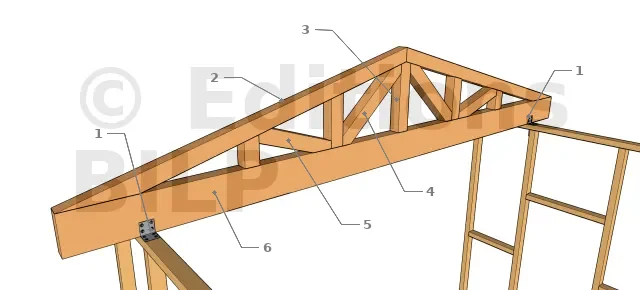 L’ossature d’une toiture est un élément essentiel pour une construction en bois. De ce fait, il faut qu’elle soit bien fixée à la construction pour qu’elle ne s’envole pas au premier coup de vent. Pour cela, nous disposons d’équerres renforcées pour maintenir cette ossature. Pour utiliser au maximum les capacités des équerres, il faudra mettre une équerre de chaque côté de la ferme pour assurer la stabilité de la structure.