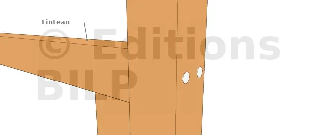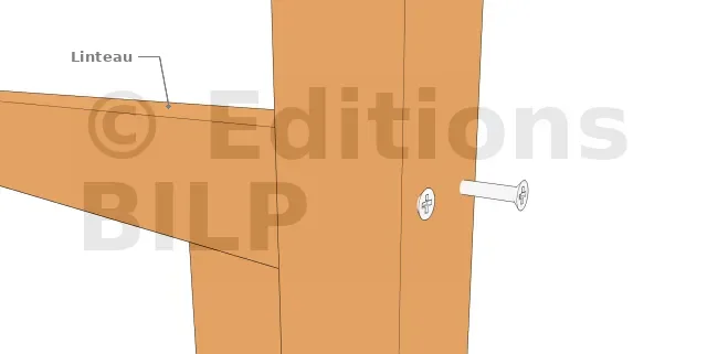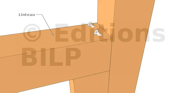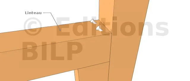 La fixation par des vis : c’est la méthode de fixation la plus courante dans une construction bois. On peut utiliser la vis de deux manières pour fixer un linteau : soit on la fixe sur la face de dessus du linteau, soit on la fixe sur le bout du linteau comme dans les images ci-dessous.
