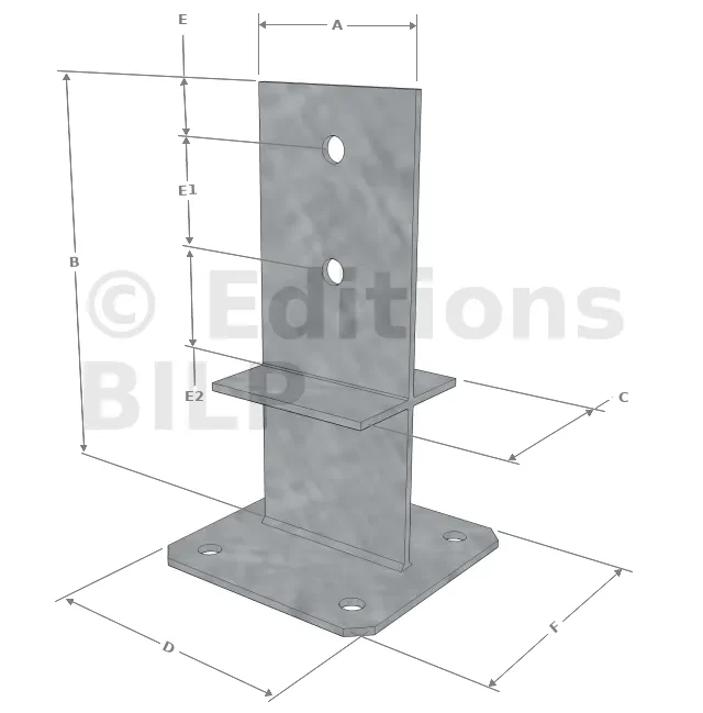 | A (mm) | B (mm) | C (mm) | D (mm) | E+E1+E2 (mm) | F (mm) | Ep (mm) | Nb trous sur l’âme | Nb trous à la base |