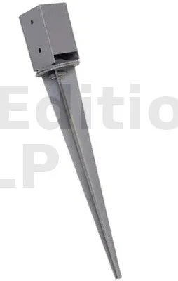 spécialement conçu pour une fixation directe dans le sol naturel. Avec sa forme pointue, elle permet d’enfoncer facilement à la force des bras ou avec une masse toute la partie sous terre, cette partie sera déterminée en fonction du besoin de la structure. Elle est faite pour fixer des poteaux en bois, pour une charge moyenne et pour les petites constructions (palissade, clôture, etc.). Accessoire pas recommandé pour une pergola.