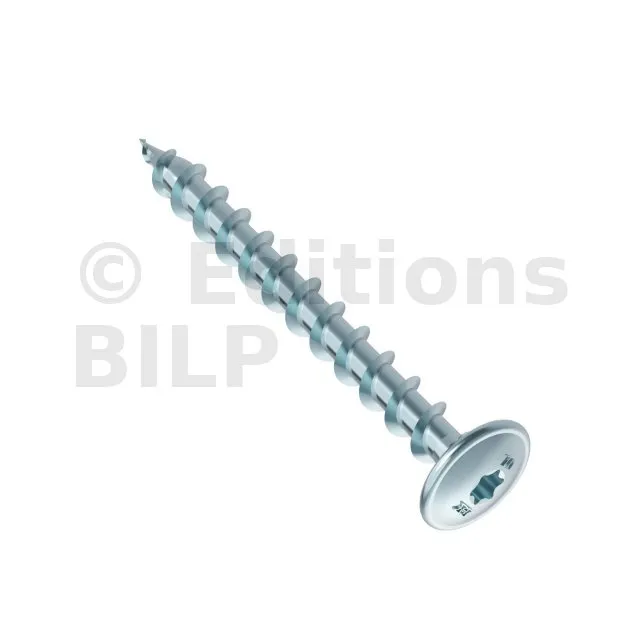 - une vis à tête cruciforme : terminée par une forme plate fraisée et deux fentes croisées, elle est adaptée pour une forte fixation au tournevis mécanique. Idéale pour assembler des éléments solides, surtout pour les vis autoforantes, avec son filetage coupant sur toute sa longueur.