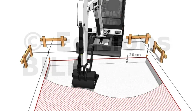 Pour de petites surfaces inférieures à 10 m², vous pouvez creuser avec une bêche et une pioche mais la location d’une petite pelleteuse économisera efforts et lombaires surtout pour une grande surface. Prévoir un emplacement pour stocker les déblais ou étalez-les uniformément sur le terrain si le gazon doit être refait ultérieurement. L’excavation peut dépasser de quelques centimètres vers l’extérieur car les coffrages ont une certaine épaisseur. Creuser sur une profondeur d’environ 20 cm. Les cordons peuvent être retirés durant cette tâche à condition d’avoir bien transmis le pourtour de la dalle au sol, en traçant à la pelle par exemple.