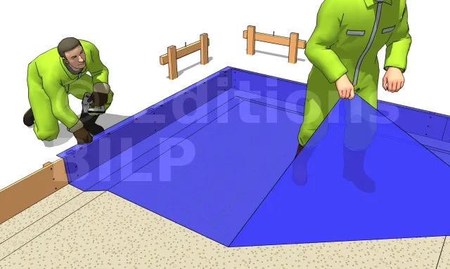 Laisser le polyane en place, ne le découpez pas. Ultérieurement, vous le ferez remonter le long de la dalle et le fixerez à la lisse basse.