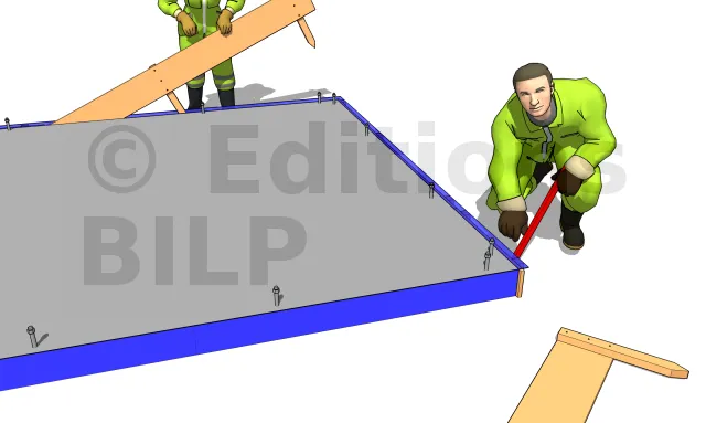 Fixer des tasseaux taillés en pointe à des planches de coffrages. Le tasseau doit affleurer le bord supérieur de la planche afin de ne pas gêner les passages de l’outil de lissage du béton ultérieurement. Planter votre planche en veillant à ce que le bord intérieur soit aligné sur le fil-repère. Assembler les planches aux angles. Vérifier également les niveaux supérieurs des planches de coffrage car cela conditionne directement la planéité et l’horizontalité de la dalle.