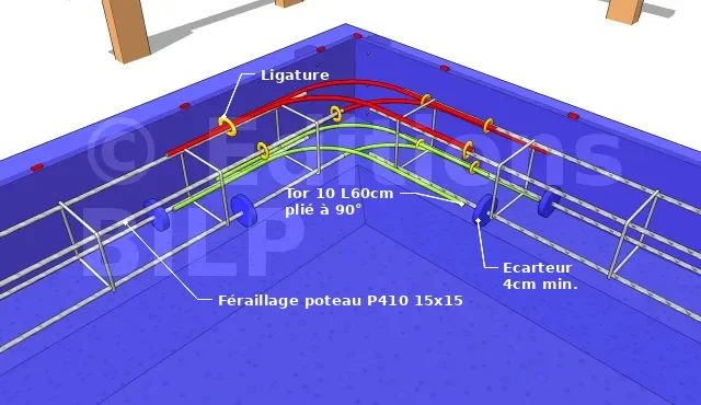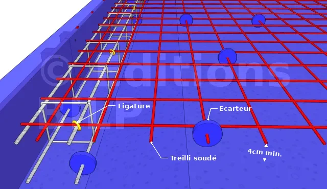 (en rouge) est posé et vient en appui sur le ferraillage P410 sur lequel il est ligaturé avec du fil de fer (en jaune). Le béton devra enrober le treillis d’au moins 4 cm. On utilise des écarteurs en plastique prévus pour cela (en bleu) que l’on peut aussi remplacer par des éclats de parpaings ou des pâtés de béton.