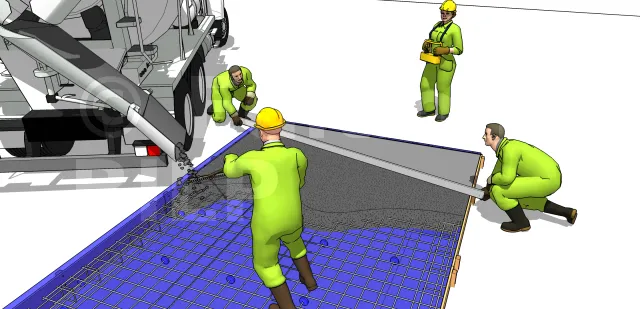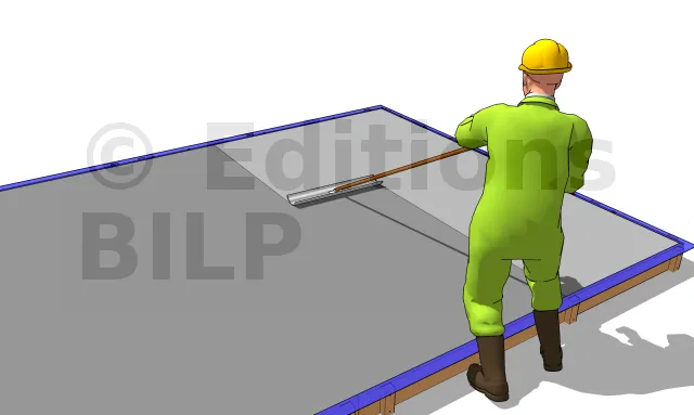 est déversé d’un bout à l’autre. Un ou deux manœuvres étalent et répartissent le béton avec râteau et pelle. Une aiguille vibrante (facultative) permet de fluidifier momentanément le béton afin de faciliter la répartition. Juste derrière, deux manœuvres tirent et nivellent le béton avec une grande règle, en pratiquant un mouvement de va-et-vient rapide selon l’axe de la règle.
