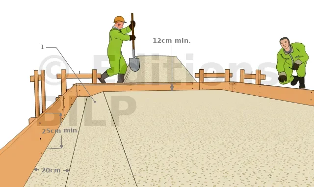 Les principes généraux sont simples. On coule une dalle ferraillée sur une forme en gravier. Les pourtours sont plus profonds et renforcés afin de former un ceinturage et éviter l’éclatement de l’ouvrage.