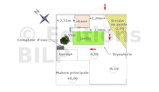 Vous pouvez ainsi situer l’emplacement exact de l’ouvrage par rapport aux éléments fixes de votre entourage (arbres, coins de murs, clôture, obstacle, etc.). Avoir à sa disposition un plan de masse permet de déterminer précisément l’emplacement des portes et fenêtres. On se rendra vite compte du trajet du soleil en plaçant une rose des vents qui indique les points cardinaux. De cette manière, vous éviterez de plonger votre cabane dans une pénombre éternelle, très pénalisante à la longue.