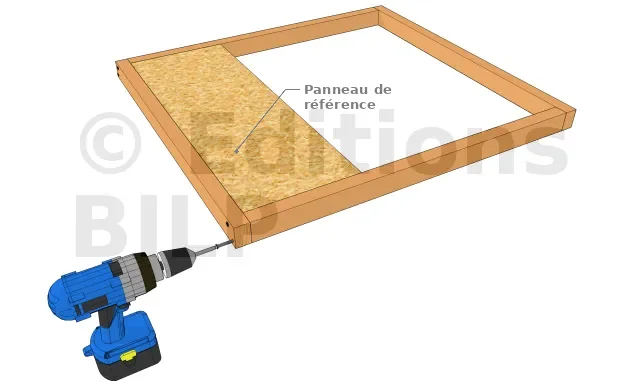 Cette technique fait appel à l’utilisation d’un panneau de bois ou d’une planche de bois selon les tailles des pièces à assembler. Il s’agit de créer un gabarit ou une référence dont les arêtes ont été préalablement découpées après avoir pris les angles droits avec une équerre de menuisier. Le panneau crée non seulement l’angle droit mais aussi et surtout l’appui pour pouvoir fixer facilement les pièces entre-elles.