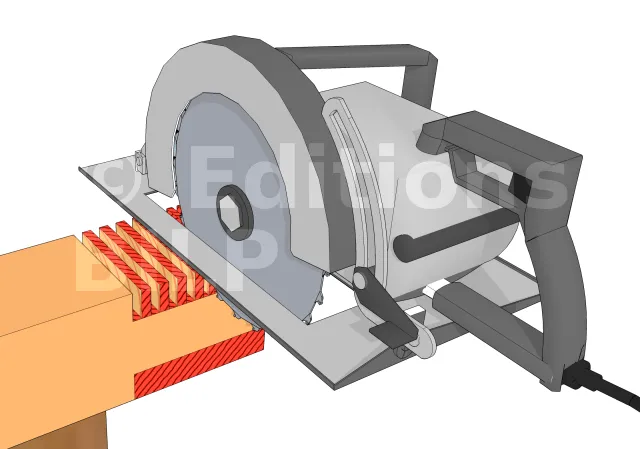 Positionner la scie, la profondeur de coupe étant réglée sur celle de l’encoche, perpendiculairement au poteau. Créer ensuite un rainurage multiple avec des traits de coupe très rapprochés sur toute la hauteur de l’encoche.