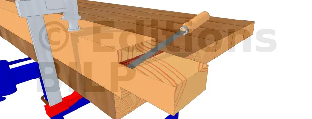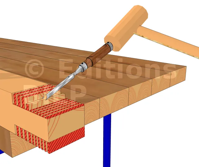 A l’aide d’un maillet et d’un ciseau à bois, dégager depuis le haut du poteau la partie rainurée pour obtenir l’encoche.