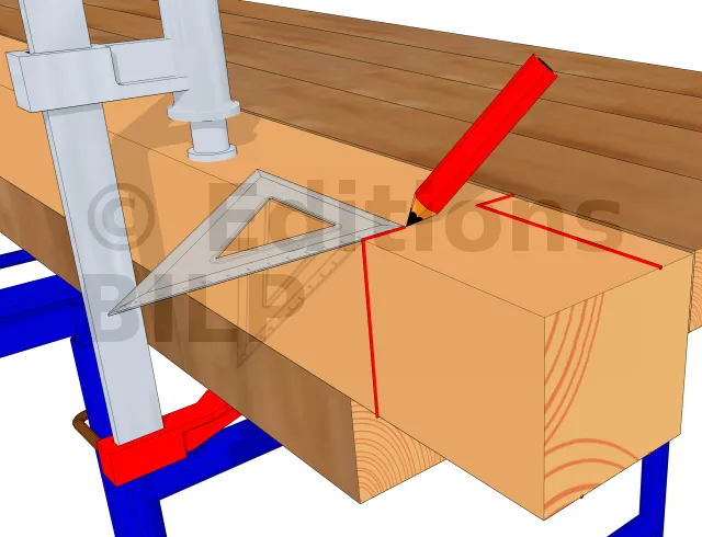 Mesurer à partir du haut du support la position de la face basse de l’encoche (Ceci peut correspondre par exemple à la position d’une panne, d’une traverse ou d’une poutre porteuse sur un poteau). Tracer ensuite avec une équerre ce repère sur toute la largeur du support.