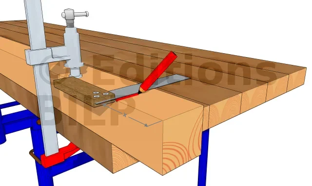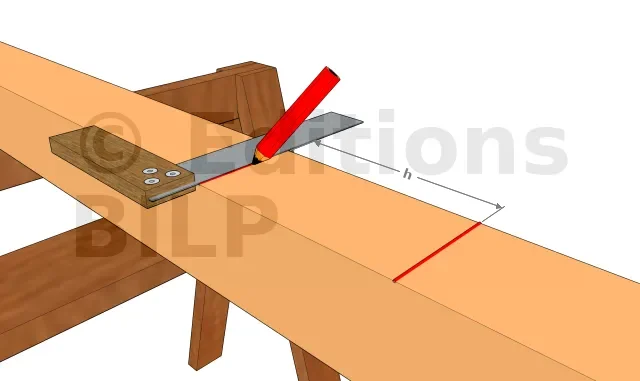 Tracer au crayon les parties basse et haute de l’encoche soit en suivant la face supérieure de la panne avec les poteaux sur place ou bien en mesurant cette hauteur avec les poteaux à l’horizontale.