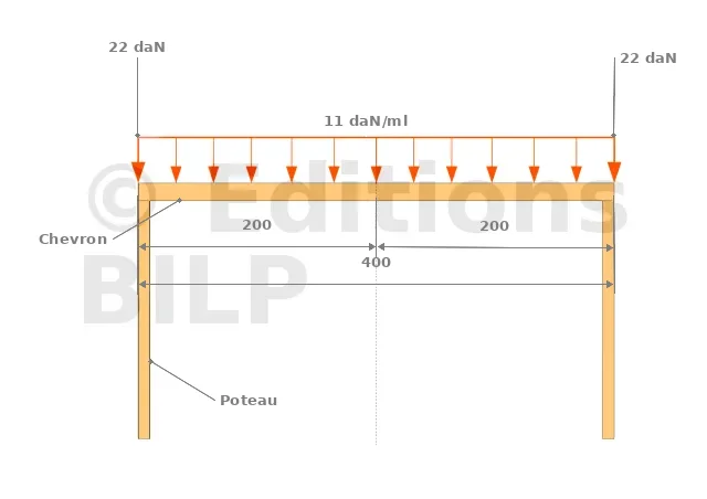 Un chevron en bois de 4m de longueur et 100 x 200mm de section est supporté par deux poteaux. Le chevron en Douglas a un poids volumique de 550daN/m3.