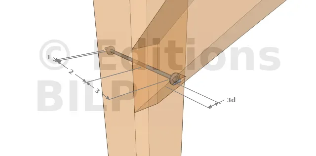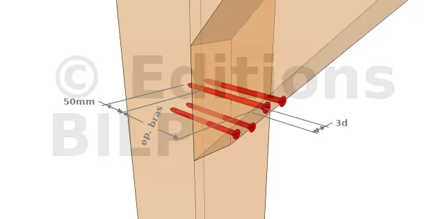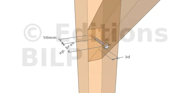 Avec ses spirales, la vis s’oppose facilement aux forces d’arrachement mais est fragile pour ce qui est de la résistance au cisaillement. La longueur d’enfoncement doit aussi être au minimum égale à 50 mm. D’une manière générale, quatre (4) vis sont utiles pour maintenir un bras de contreventement. La distance au bord doit au minimum être de 3 fois le diamètre de la vis pour éviter d’éclater le bois.