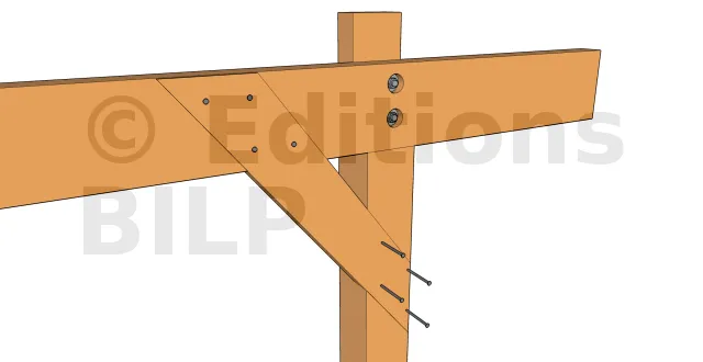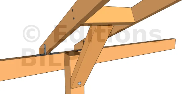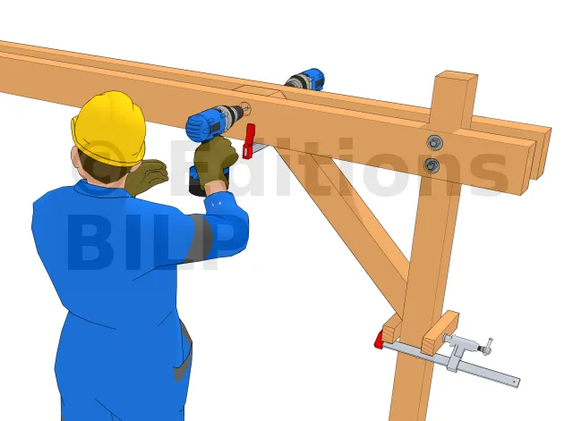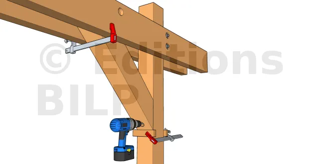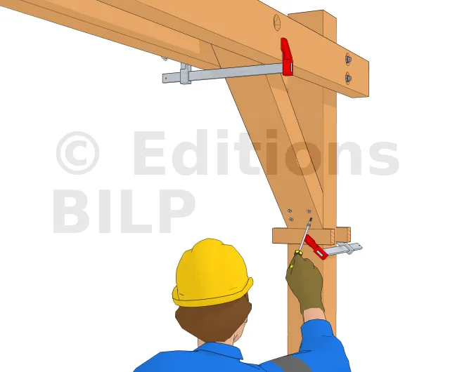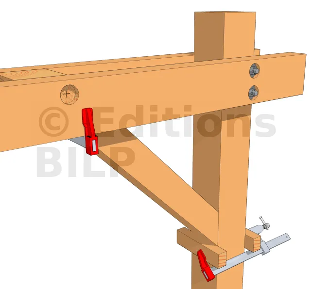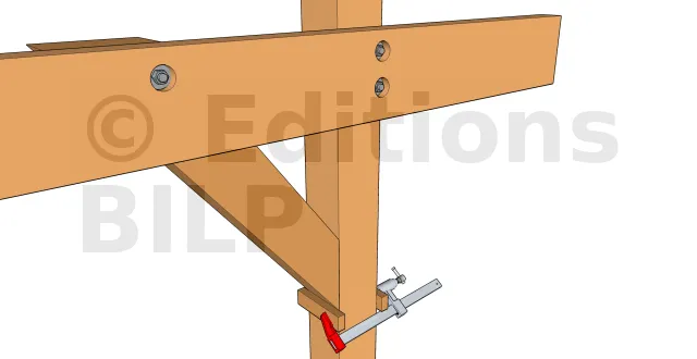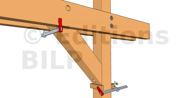 - 1 : Mettre en place la jambe en alignant l’extrémité supérieure de cette jambe avec la face supérieure des pannes. Fixer un premier serre-joint sous la jambe au poteau pour la tenir à sa position. Des petits tasseaux de part et d’autre permettront de faciliter l’alignement. Si la partie haute de la jambe n’est pas conçue pour s’aligner aux pannes, il suffit d’aligner sa partie basse au poteau.