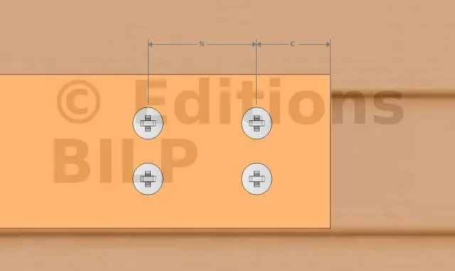 Ainsi, pour 4 paires de vis, nous avons une distance au bord égale à c = 300 - 38 * (4 - 1) / 2 = 93 cm. Comme la valeur de 93 cm est un peu trop élevée par rapport à la distance entre-axe, on va augmenter le nombre de vis à 7 pour un avoir une distance au bord égale à c = 300 - 38 * (7-1) / 2 = 36 cm.