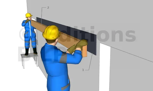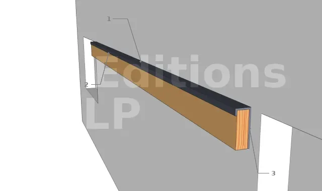 Interposer une bande bitumineuse épaisse entre la muralière et le mur. Laisser dépasser la bande vers le haut sur une largeur équivalente à l’épaisseur de la panne + 3 cm. Aucune partie de la panne ne doit être en contact avec le mur, la largeur totale de la bande est donc égale à la largeur de la panne + épaisseur de la panne + 3 cm.
