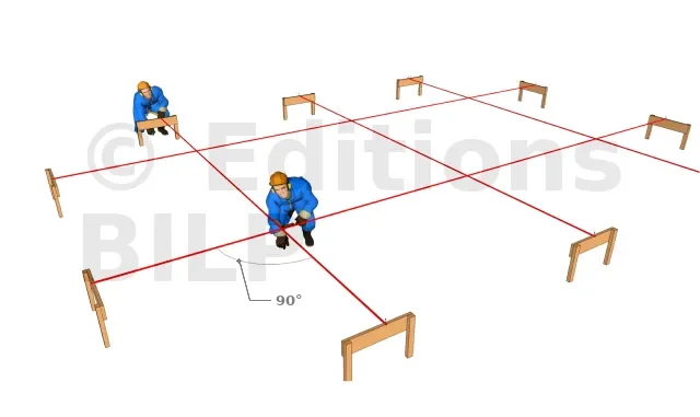 Une fois tous les cordeaux reliés, on doit avoir un rectangle qui est formé par l’axe des pieds de poteaux. Il est impératif de vérifier l’équerrage des cordeaux pour éviter au final d’avoir une structure difforme.
