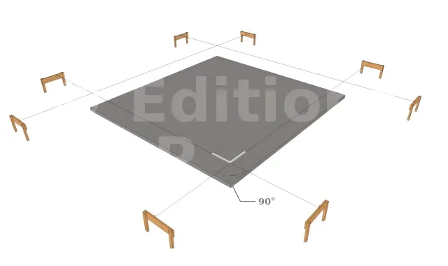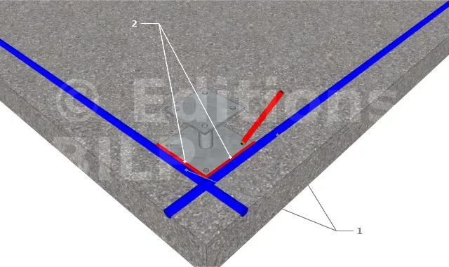 Il est à noter que la technique de repérage dans l’axe est toujours valable, permettant ensuite de déplacer les repères sur la dalle à partir des coins des pieds de poteaux. Mais pour aller plus vite, les repères sur les chaises sont généralement portés sur les coins de la dalle. Il suffit donc de directement déplacer les repères sur les coins des pieds au lieu de passer par l’axe.