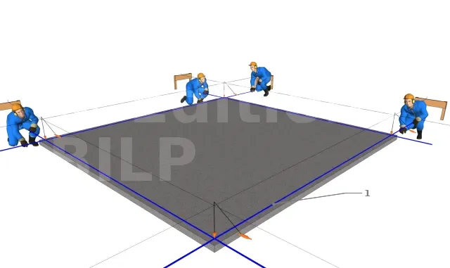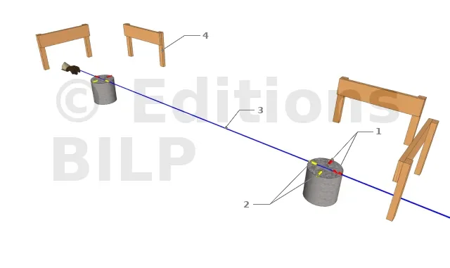 Cette technique est utilisée pour l’implantation des pieds de poteaux à ancrer et ceux à fixer sur des plots en béton. C’est la même méthode que celle utilisée pour l’implantation générale de la structure sur fondation avec plots en béton.