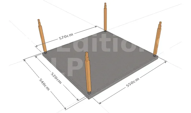 Prenons l’exemple d’une dalle finie de dimension 570 cm x 540 cm. Nous avons décidé de décaler l’implantation des pieds de poteaux de 10 cm des bords de la dalle. Le contour extérieur des pieds de poteaux donne alors un rectangle de 550 cm x 520 cm.