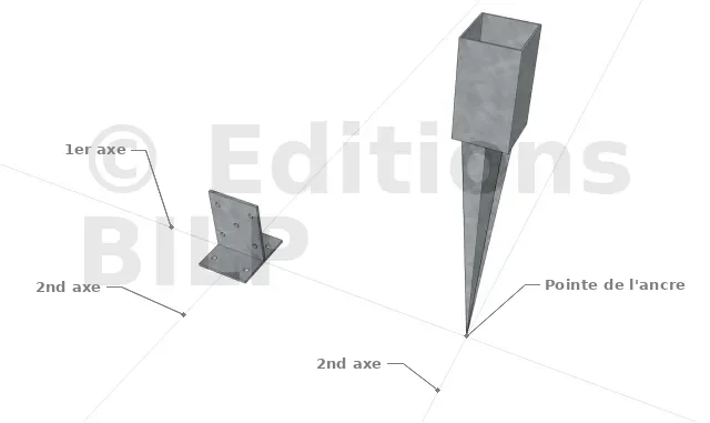 Pour implanter les pieds de poteaux à ancrer, il suffit de prendre l’aplomb des intersections formées par les cordeaux. Vous pourrez par la suite ancrer les pieds de poteaux dans le sol en utilisant directement l’accessoire ou bien en le matérialisant avec un piquet.