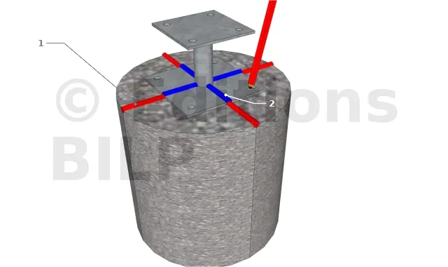 - 2 : milieu des quatre côtés de la platine de base des pieds de poteaux