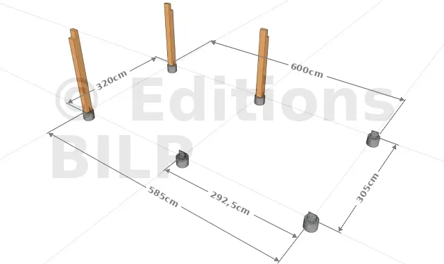 Supposons que nous ayons des pieds de poteaux en T, dont les bases sont de dimensions identiques à celles des poteaux de 15 cm x 15 cm. Les quatre coins extérieurs de ces pieds de poteaux forment un rectangle de 600 cm x 320 cm.