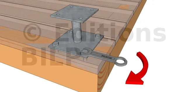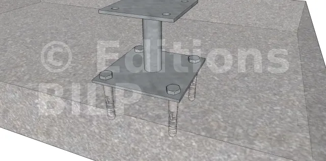 - Placer le pied de poteau. Si le pied de poteau est à deux platines fixes, la vis MULTI MONTI utilisée est à tête hexagonale. Sinon, la vis à tête ronde est utilisable. L’ajout de rondelles est recommandé pour accroître la prise de la vis.
