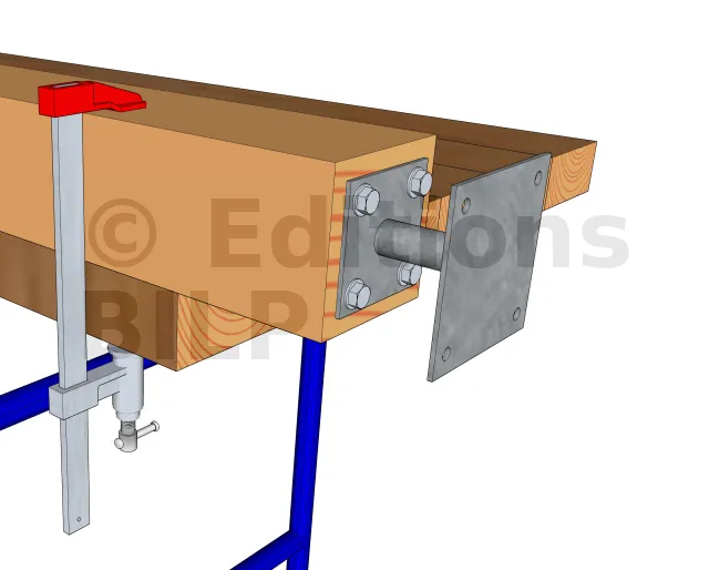 Pour le second cas de la vis de fixation, fixer ensuite le poteau au pied de poteau avec des tire-fonds et maintenir l’ensemble avec des tasseaux.