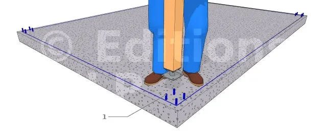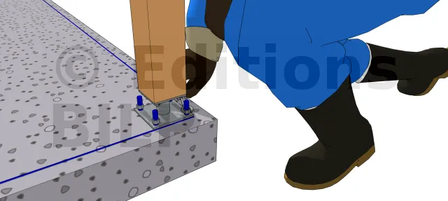 Pour la fixation du poteau sur le pied de poteau ou vis versa, consulter cet article. Dans cette illustration, on va supposer que la fixation d’un pied de poteau à 2 platines se fait par scellement chimique des tiges filetées.